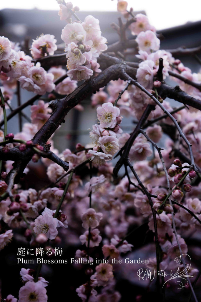 庭に降る梅 枝垂れた梅が、重なりながら庭を埋めていく。 丸い蕾と、開いた花びら。濃い幹に沿って、春の重さだけが下へ集まる。 屋根の気配を背に、満開の気配が静かに... -
