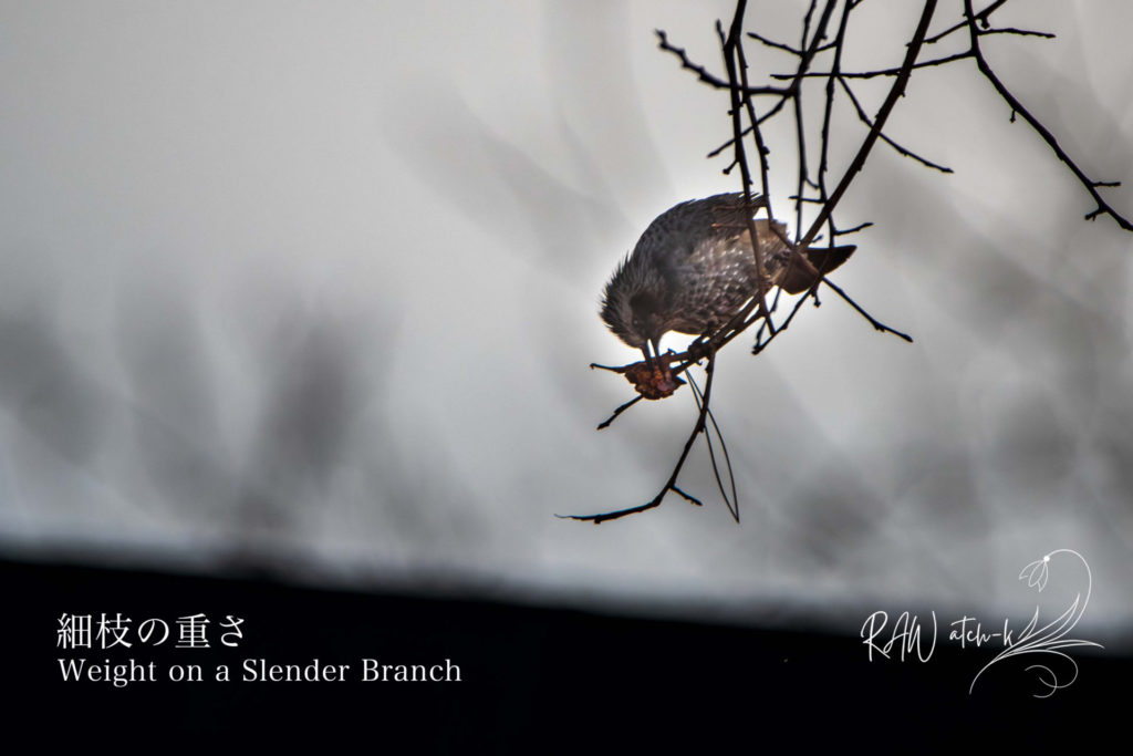 細枝の重さ しなる細枝の先で羽を閉じたまま体が傾く。 白梅の花を嘴が押さえ、 崩れた花弁が指先ほど落ちた。 花は何も言わず、次の動きだけを枝に残す。 — atch-k Wei... -