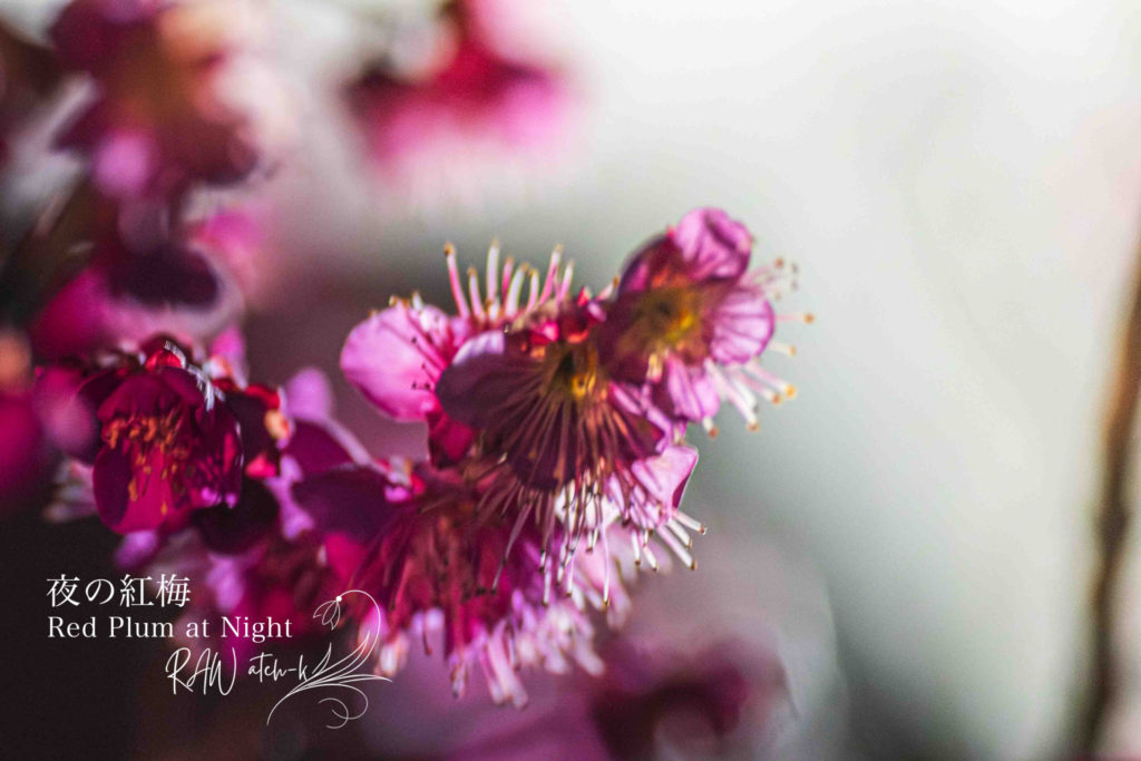 夜の紅梅 濃い影の中で細い蕊が光を拾う。 触れない風が枝をわずかに揺らし、 色は深く沈み、紅だけが夜に映える。 — atch-k Red Plum at Night Within the deep shadow... -