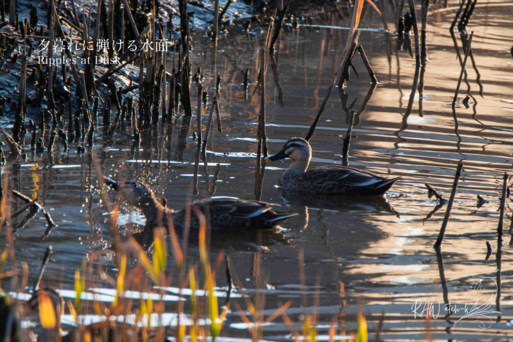 夕暮れに弾ける水面 夕方の貯水池。枯れた枝の間を、二羽の鴨が進む。一羽が水面に顔を入れた瞬間、光が小さく弾けた。一日の終わりが、少し近づく。 — atch-k Ripples ... -