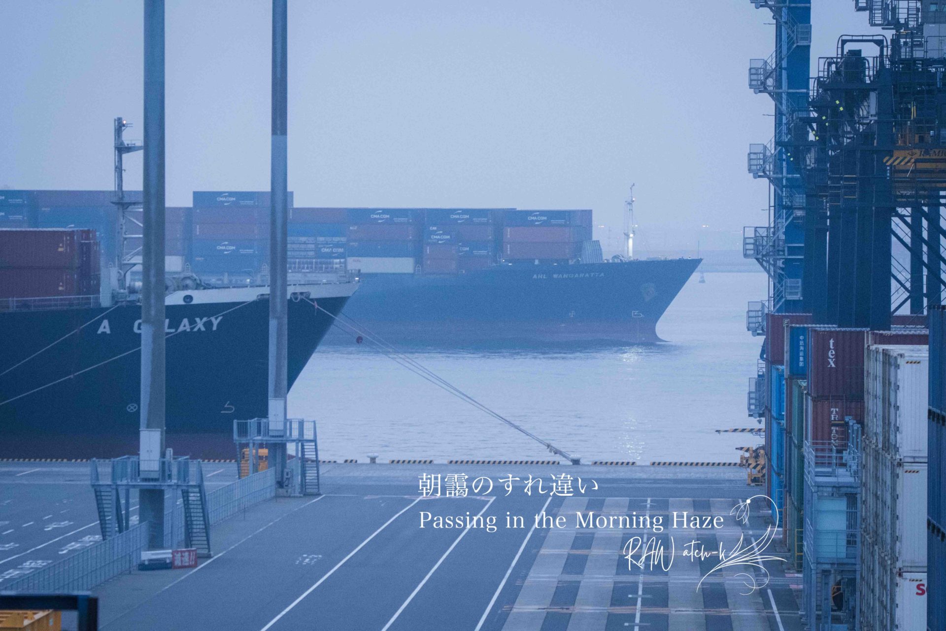 港湾のコンテナターミナル、早朝の海上を航行する大型コンテナ船、青白い朝霧、荷役クレーンと積載コンテナ群