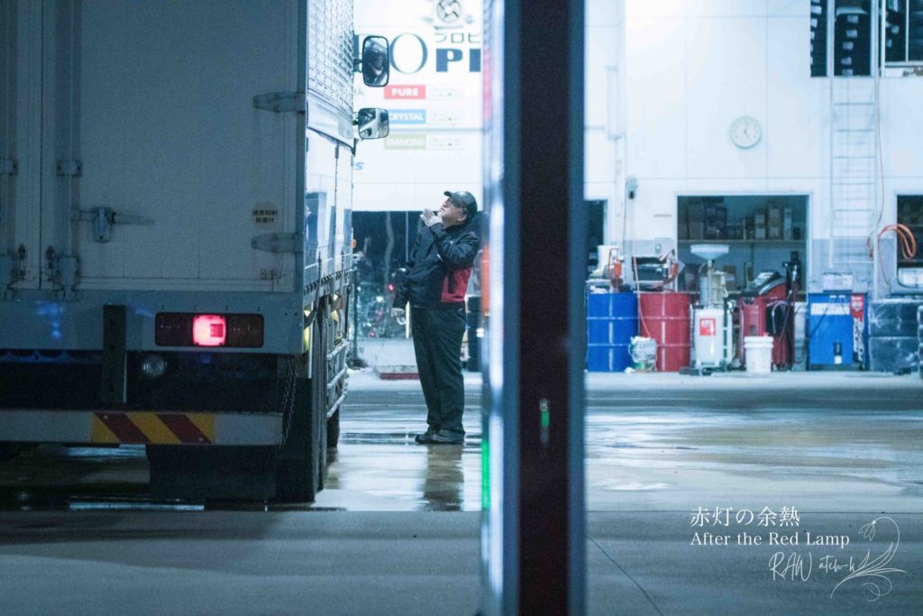 赤灯の余熱 白い灯り、休まない荷の鼓動。 男の横顔が、往復する夜を静かに見送る。 赤い灯が、今日の終わりをひとつ照らす。 — atch-k After the Red Lamp Under the w... -